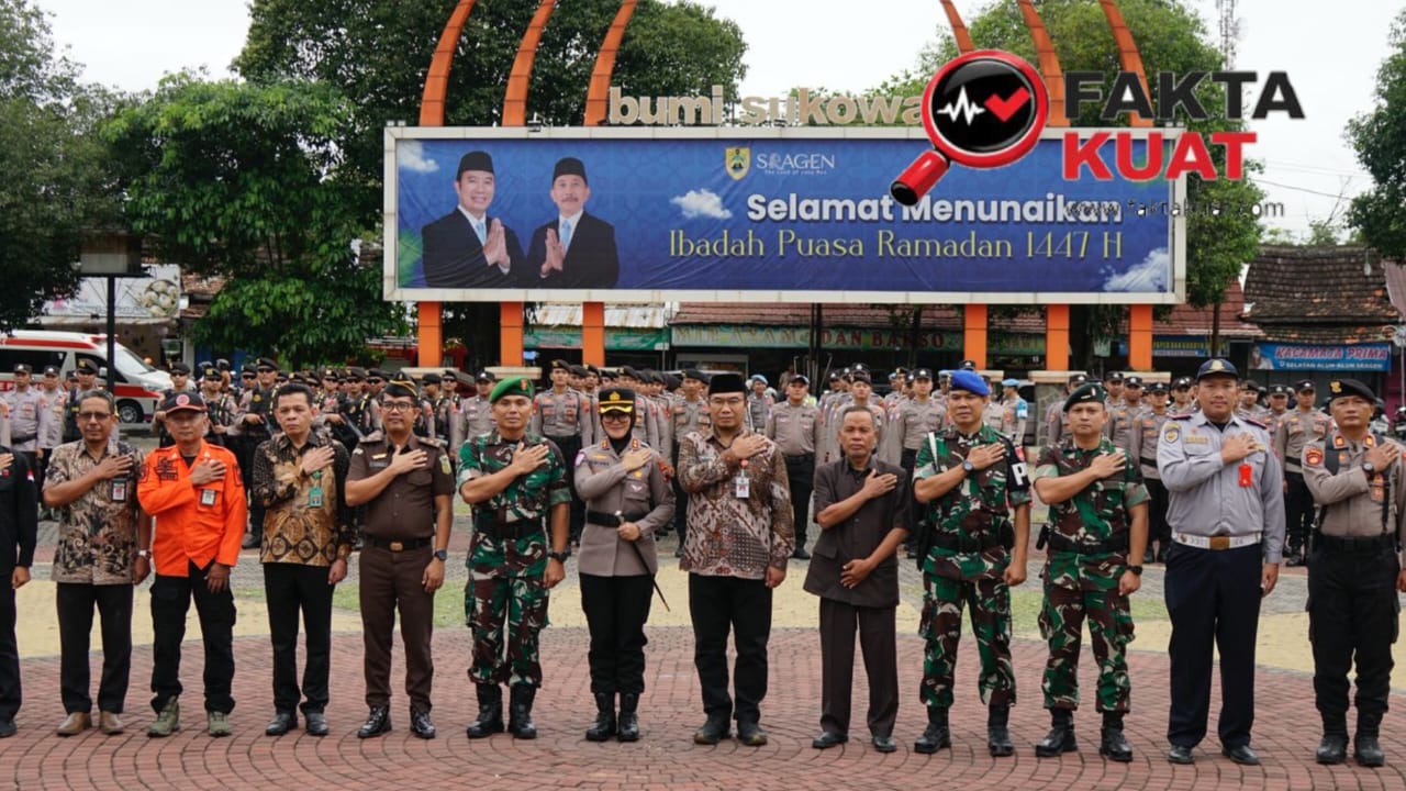 SRAGEN, JATENG – Untuk memastikan pelaksanaan ibadah puasa Ramadhan 1447 H/2026 M berjalan aman dan khusyuk, Polres Sragen menggelar Apel Siaga Kamtibmas di Alun-Alun Sasono Langen Putro, Jumat (27/2/2026) sore.