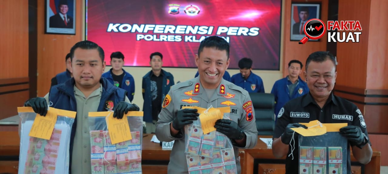 Polres Klaten menggelar konferensi pers pengungkapan tindak pidana peredaran uang palsu jaringan lintas provinsi di Mapolres Klaten, Selasa (3/3/2026). Dalam rilis tersebut, Kapolres Klaten AKBP Moh. Faruk Rozi, S.H., S.I.K., M.Si. menyampaikan bahwa Satreskrim Polres Klaten berhasil mengamankan empat tersangka yang terlibat dalam produksi dan peredaran uang rupiah palsu pecahan Rp100.000.