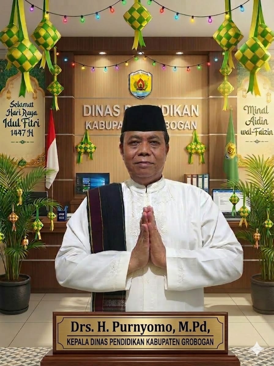 GROBOGAN Faktakuat.com – Kepala Dinas Pendidikan Kabupaten Grobogan, Drs. H. Purnyomo, M.Pd., menyampaikan ucapan selamat Hari Raya Idul Fitri 1 Syawal 1447 Hijriah yang jatuh pada tahun 2026 kepada seluruh lapisan masyarakat, khususnya bagi para guru, tenaga kependidikan, serta peserta didik di wilayah Kabupaten Grobogan.