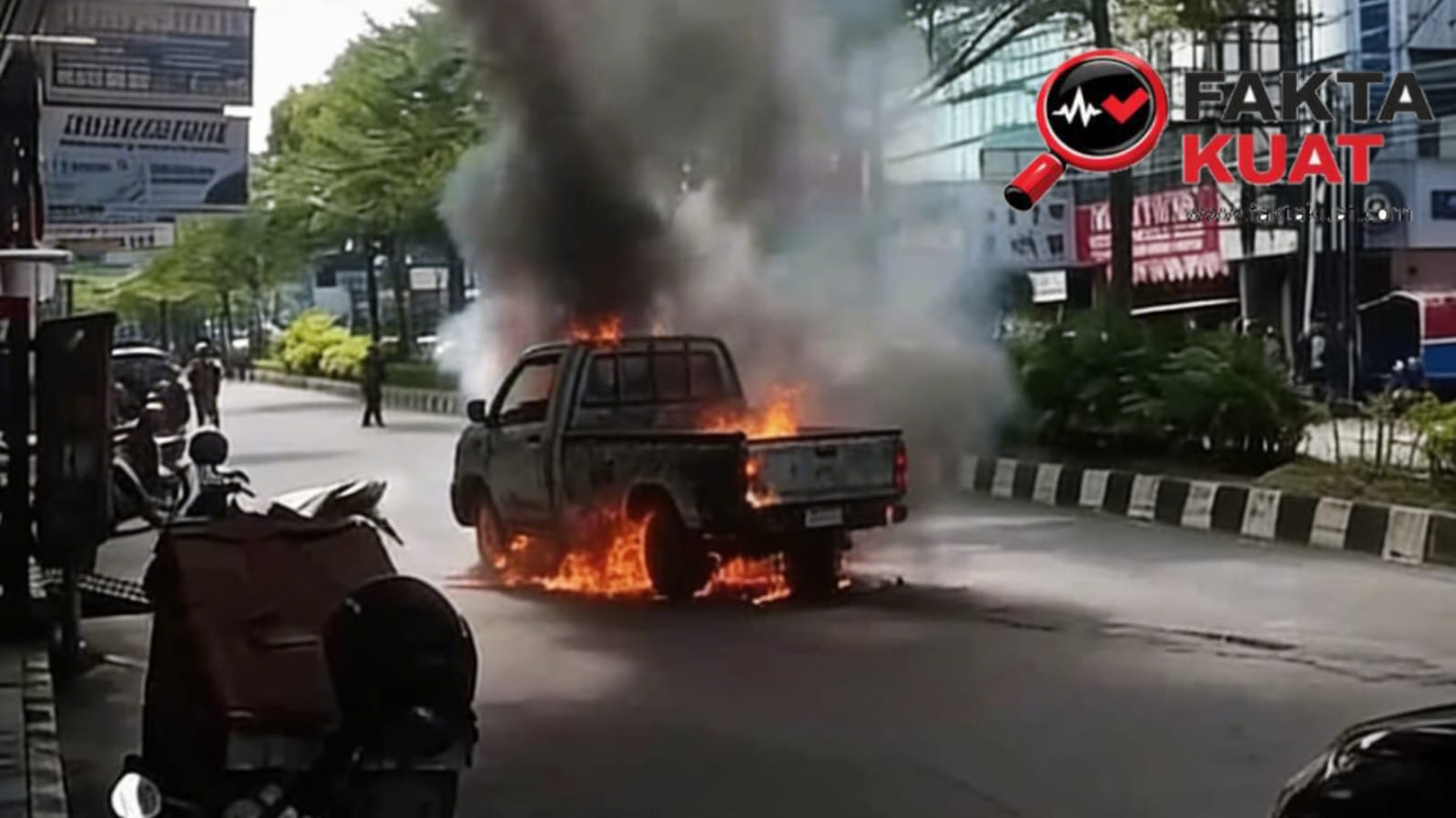 Api dengan cepat membesar dan melahap hampir seluruh bagian kendaraan di tengah aktivitas lalu lintas yang sedang ramai. Kepulan asap hitam pekat membumbung tinggi, terlihat dari kejauhan dan langsung menarik perhatian warga serta pengendara yang melintas.