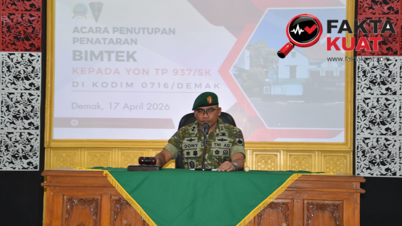 Demak – Komando Distrik Militer 0716/Demak menggelar kegiatan Penutupan Bimbingan Teknis bagi personel staf Batalyon TP 937/Satria Kalijaga. Kegiatan ini secara resmi di tutup langsung oleh Komandan Kodim, Letkol Arm Dony Romansyah, Jum’at (17/4/2026).