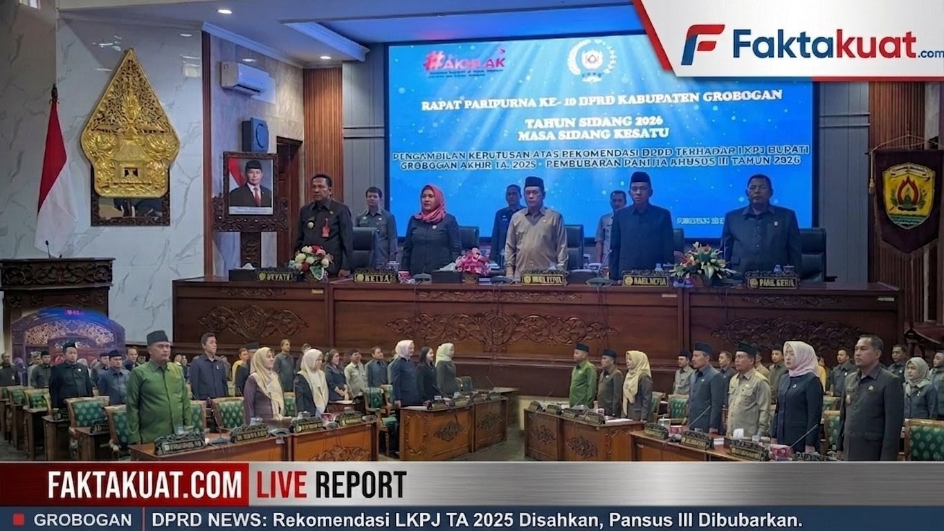 GROBOGAN, Faktakuat.com – Dewan Perwakilan Rakyat Daerah (DPRD) Kabupaten Grobogan resmi menetapkan poin-poin rekomendasi terhadap Laporan Keterangan Pertanggungjawaban (LKPJ) Bupati Grobogan Akhir Tahun Anggaran 2025. Penetapan ini dilakukan dalam Rapat Paripurna ke-10 yang digelar di Ruang Sidang Utama DPRD, Rabu (22/4/2026).